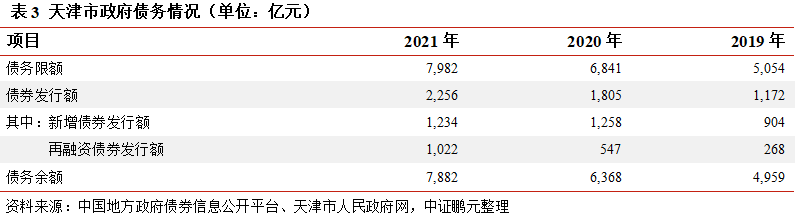 天津市廣義債務率全國居首,再融資券發行緩解地方債務壓力。2020-2021年末天津市地方政府債務余額同比分別增長28.41%和23.78%,各年新增政府債券發行額均超過1,200億元,2020年末地方廣義債務率577.49%,在全國居首。2020年起部分地方政府再融資債券募集資金用途調整為“償還地方政府存量債務”,發行規模隨之提升,再融資債券被認為是解決地方政府隱性債務的方式之一,2021年天津市發行超千億再融資債券緩解地方債務壓力。截至2021年末,天津市地方政府債務余額7,882億元,其中市級債務余額2,309億元,占債務余額比重29.3%,其余分散在下屬區級政府。