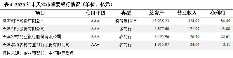 天津市本地有3家城農商行,近年區域存貸款余額持續增長。天津市本地銀行機構含渤海銀行、天津銀行、天津農商行和天津濱海農商行,其中渤海銀行為股份制銀行,其余為市城農商行,天津銀行和渤海銀行分別于2016年和2020年在香港掛牌上市。此外,天津市國資委間接持有渤海證券、北方國際信托股份,系上述金融機構實際控制人;區域融資租賃行業發展全國領先,截至2020年末,天津市總部法人融資租賃公司達到1,764家,資產總額約1.8萬億元。2019-2021年天津市存貸款余額持續增長,2021年末中外金融機構本外幣各項存款余額3.59萬億元、貸款余額4.11萬億元,同比增長均超過5%,近兩年制造業、高技術制造業、高技術產業中長期貸款增加較多。