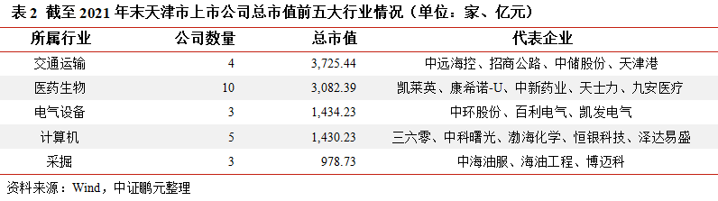 上市公司市值集中于交通運輸和醫藥生物產業,混改為區域國企注入新活力。截至2021年末,天津市A股上市公司共63家,其中交通運輸行業市值規模占比約27%,醫藥生物上市公司數量最多,上市公司市值集中在頭部企業,前五大上市公司市值占比過半。天津市地方國企數量多,但上市數量和市值規模小,資本市場表現缺位。近年天津市政府主導混改行動,成功落地天津建材集團、天津信托、天津住宅集團、中環集團、天津醫藥集團等混改項目。