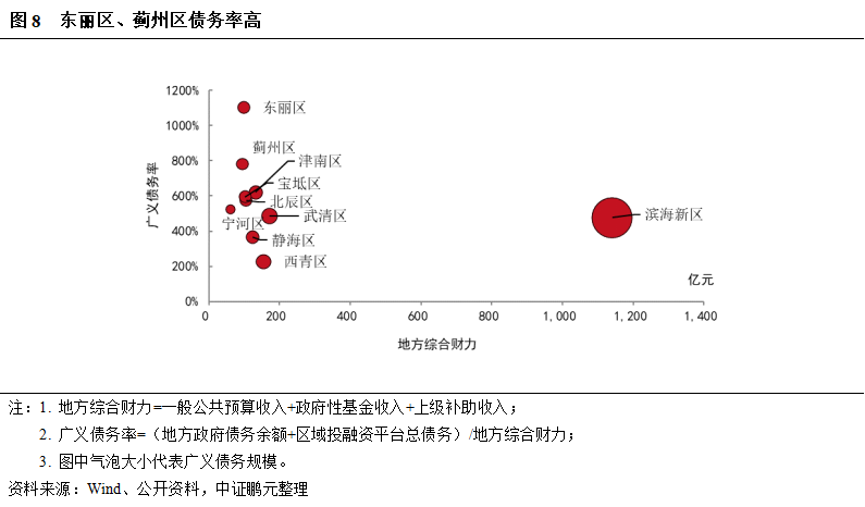 濱海新區融資體量大,東麗區債務負擔重。2020年末天津市濱海新區、東麗區廣義債務規模(地方政府債務余額+區域投融資平臺總債務)逾千億元,前者體量超過5,400億元,但濱海新區地方綜合實力較強,債務率水平在天津市下轄區(除中心城區外)中排名靠后。2020年末東麗區廣義債務率超過1,000%,債務負擔重;薊州區、津南區廣義債務率在600-800%區間;其他區域廣義債務率多在450-600%區間范圍;西青區債務率最低,為227.23%。
