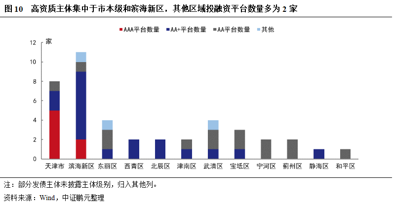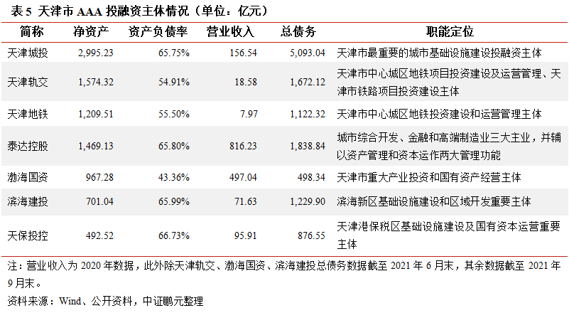 天津市投融資平臺和高資質主體集中于市本級和濱海新區,濱海新區主體實控人多為下屬功能區管委會。截至2021年末,天津市、區級有存續債務的投融資平臺共42家,AAA和AA+平臺數量分別為7家和18家,市區高資質主體集中在市本級和濱海新區,但濱海新區主體實控人主要系下屬功能區管委會,目前除東疆保稅港區外,其余功能區均有發債主體。天津城投為天津市最重要的城市基礎設施建設投融資主體,業務涵蓋城市路橋、環境水務、軌道交通和城市綜合開發四大板塊;泰達控股引領的泰達系企業覆蓋城市綜合開發、金融和高端制造業三大主業,輔以資產管理和資本運作兩大管理功能,上述企業為天津市代表性投融資主體,市場關注度較高。