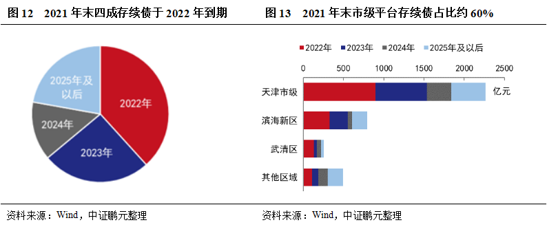 債券發行結構短期化影響到期償付安排,市級平臺存續債余額占比高,四成存續債于2022年到期。2021年天津市短期融資券發行占比較2020年提高32個百分點,債券發行結構短期化,該部分融資自2021年下半年起密集償付。截至2021年末,天津市級和下屬區級投融資平臺有1,458.4億元和974.6億元存續債分別于2022年和2023年到期,合計占比63.9%,其中濱海新區、武清區、津南區和寶坻區過半存續債需在2023年前償付,短期債務集中度高。從存續債區域分布看,2021年末約60%存續債集中在市級平臺,其他區域中濱海新區、武清區和北辰區存續債超百億元。