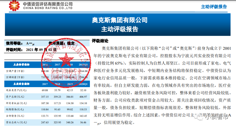 9月2日,中債資信給予奧克斯集團有限公司(以下簡稱“奧克斯集團”)主體評級為A-,評級展望“穩定”。