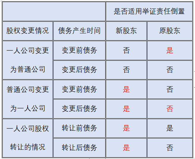 另外,對于變更為普通公司后新加入的股東,以及變更為普通公司后新產(chǎn)生的債務。一方面,因為新股東加入時,其利用一人公司的特殊治理結(jié)構(gòu)隨意支配公司財產(chǎn)的客觀條件已不存在;另一方面,也不存在債權(quán)人會基于公司之前的登記公示信息而對公司當下的償債能力產(chǎn)生合理預期的可能。因此,對于新加入的股東以及變更為普通公司后新產(chǎn)生的債務,股東無需因舉證責任倒置而承擔連帶清償責任。