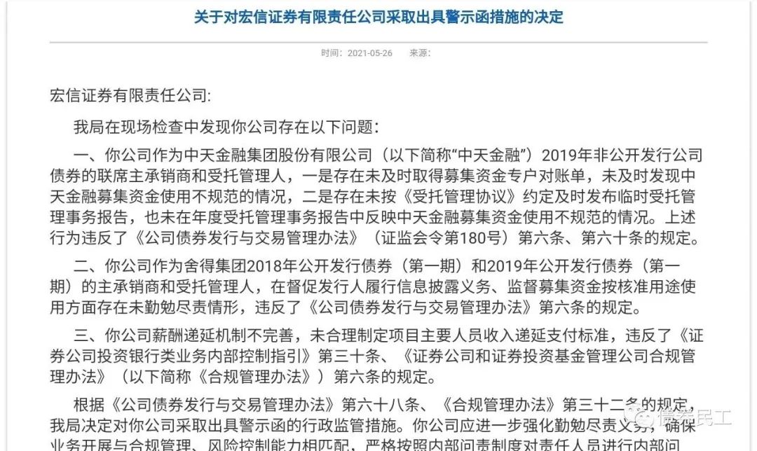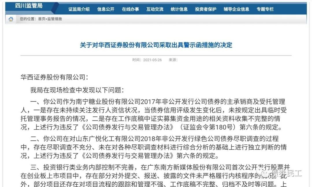 根據中國證監會四川監管局于2021年5月26日披露的公開信息,華西證券股份有限公司和宏信證券有限責任公司被出具警示函措施,其中債券存續期受托管理問題是很重要的被處罰原因。