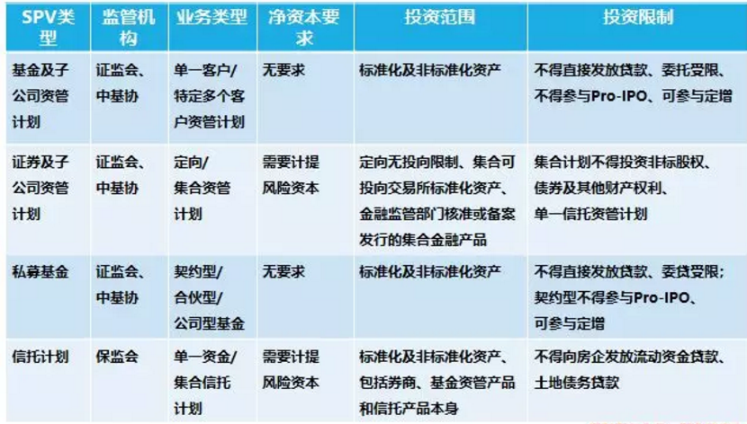 投資主體(SPV公司):投資形式主要有股權投資計劃、信托計劃、私募股權投資基金等