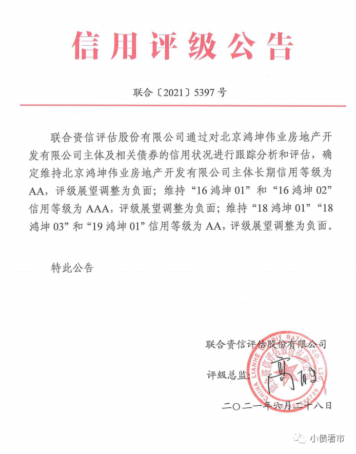 6月28日,聯(lián)合資信公告稱,維持北京鴻坤偉業(yè)房地產(chǎn)開發(fā)有限公司(以下簡(jiǎn)稱“鴻坤地產(chǎn)”)主體長(zhǎng)期信用等級(jí)為AA,評(píng)級(jí)展望調(diào)整為負(fù)面。
