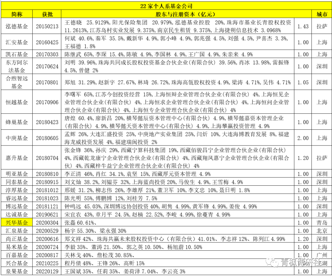 (一)41號(hào)文明確提出審慎有序核準(zhǔn)自然人發(fā)起設(shè)立基金管理公司,這實(shí)際上是收緊自然人發(fā)起設(shè)立基金公司的措辭,后續(xù)將強(qiáng)化對(duì)自然人的審核。根據(jù)統(tǒng)計(jì),目前共有22家個(gè)人系基金公司獲批(2015與2016年各1家、2017年4家、2018年8家、2019年1家、2020年5家以及2021-2022年各1家),數(shù)上已非常可觀,且資質(zhì)上整體偏弱,繼續(xù)擴(kuò)容的必要性已經(jīng)沒(méi)了。