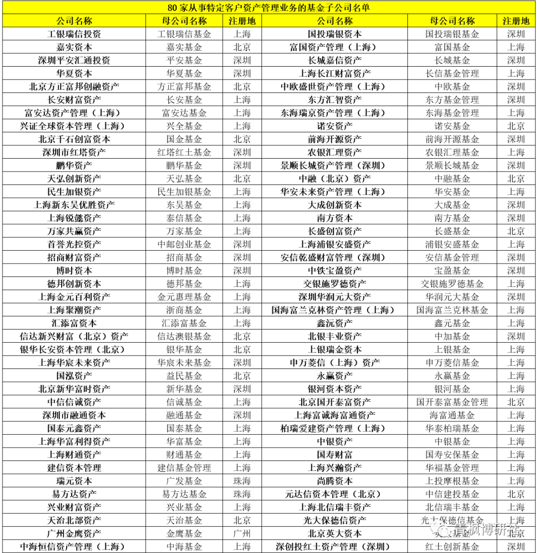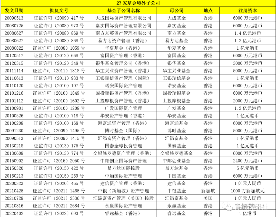 根據(jù)證監(jiān)會(huì)公布的數(shù)據(jù),截至目前,共有80家從事特定客戶資產(chǎn)管理業(yè)務(wù)的基金子公司,共有27家基金公司設(shè)立了境外子公司(美國(guó)1家、新加坡1家以及香港25家),名單具體見(jiàn)下表。