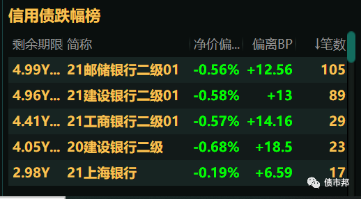郵儲、建行和工行新發(fā)的二級資本債繼續(xù)偏離估值放量暴跌,成交量領跑信用債市場。其中21郵儲銀行二級01在今天的交易筆數(shù)甚至超過了同日非活躍10年期國開債了,原來信用債也能摸到利率債的流動性門檻。