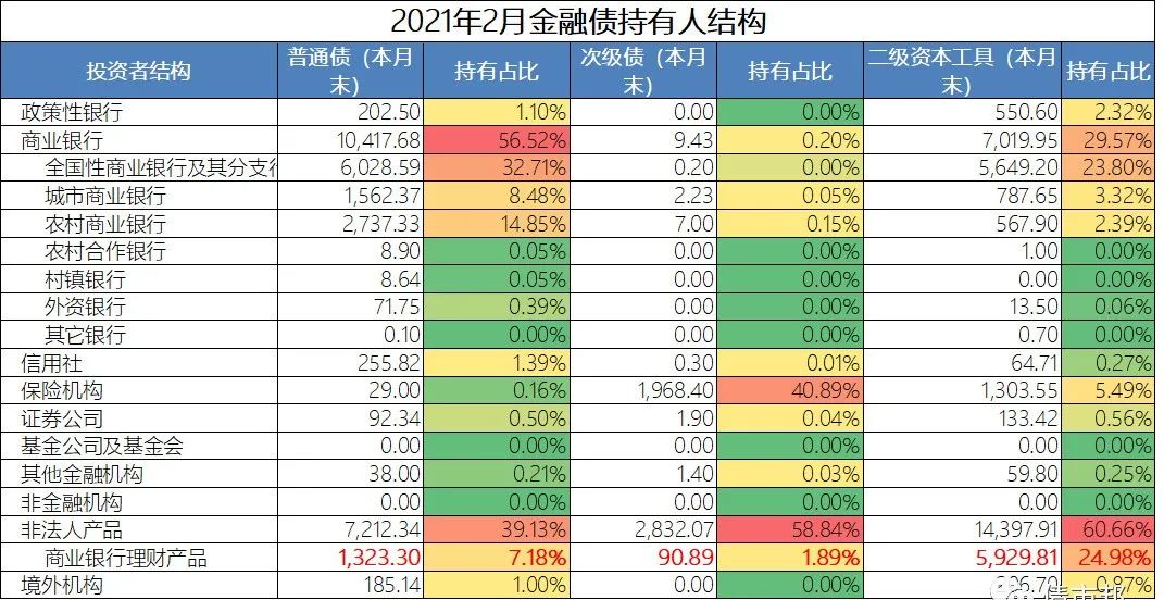 有意思的是,相比于對二級資本債的熱情,銀行理財對收益率更高的銀行永續(xù)債卻不那么感冒,2021年2月的數(shù)據(jù)顯示其持有占比不到2%。