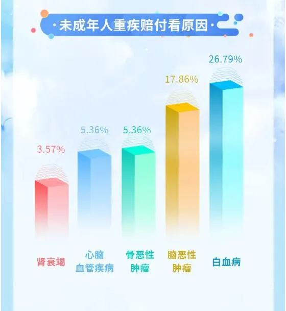 從男性和女性患惡性腫瘤的部位看,甲狀腺癌已成為成年人群體占比排名“數一數二”的惡性病。在未成年人重疾賠付原因中,白血病以26.79%的比例高居榜首。