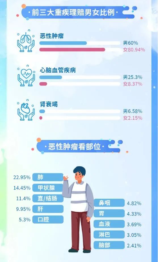 其中,在發病概率累計超過80%的前三大重疾理賠數據中:男性患惡性腫瘤的比例為60%,患心腦血管病的比例為25.3%,患腎衰竭的比例為6.58%;女性患惡性腫瘤的比例為80.94%,患心腦血管病的比例為8.37%,患腎衰竭的比例為2.15%;