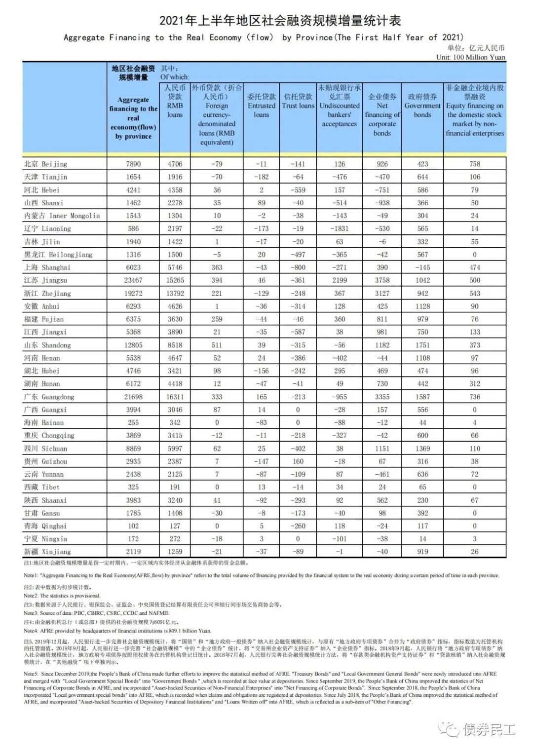 中國人民銀行于2021年8月2日披露了《2021年上半年地區社會融資規模增量統計表》,表中詳細披露了各個省市的債券融資增量情況。