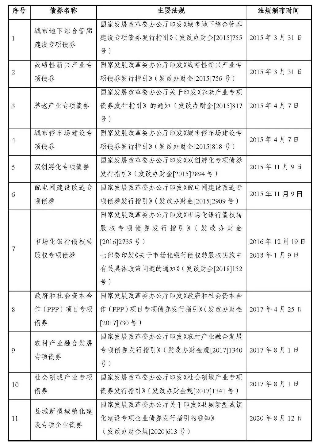 專項債券是國家發改委2015年開始推出的創新企業債券產品,2015年推出了6個專項債券品種,2016年推出了1個專項債券品種,2017年推出了3個專項債券品種,2018年至2019年無無新的專項債券品種,2020年推出了1個專項債品種。目前國家發改委專項債券已經有11個品種,主要監管法規和推出時間詳見下表: