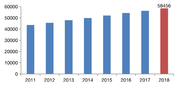 伴隨著城鎮(zhèn)化的加速推進(jìn),有限的土地空間已經(jīng)不能適應(yīng)人民生產(chǎn)和生活的需要,城市建成區(qū)擴(kuò)張成為經(jīng)濟(jì)發(fā)展的必然選擇。2018年底全國(guó)城市建成區(qū)面積達(dá)58456平方公里,較2011年增加了34%,建成區(qū)規(guī)模擴(kuò)張迅速。
