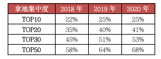 表:銷售50強房企2018年至2020年拿地建面集中度情況