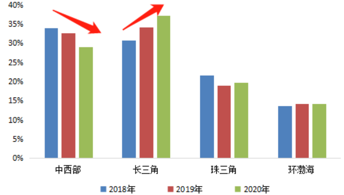 長三角是國內發展較為完備的城市群之一,經濟實力強勁、城市發展相對均衡,三四線城市優勢明顯,擁有較強的購買力,同時新經濟活躍度高、周邊一二線城市紅利輻射強,從2018年到2020年,50強房企在三四線城市的拿地中,長三角占比持續提升,從2018年的31%提升至2020年的37%。