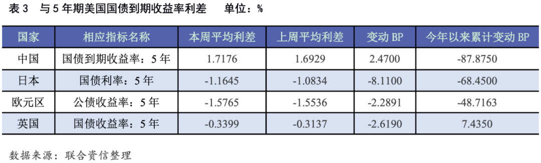 本周各期限中美國債平均收益率利差走勢不一,1年期中美國債平均收益率利差較上周收窄2.27個BP至2.23%;5年期和10年期中美國債平均收益率利差分別較上周走擴2.47個和9.44個BP至1.72%和1.40%。本周1年期、5年期和10年期日美國債平均收益率利差分別較上周走擴1.82個、8.11個和0.10個BP至-0.23%、-1.16%和-1.48%。本周1年期和10年期歐元區公債與相應期限美債平均收益率利差分別較上周收窄0.02個和3.99個BP至-0.83%、-1.68%;5年期歐元區公債與相應期限美債平均收益率利差較上周走擴2.29個BP至-1.58%。本周5年期和10年英美國債平均收益率利差分別較上周收走擴2.62個和0.81個BP至-0.34%和-0.48%。