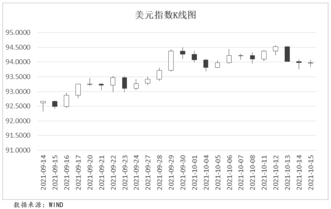 本周,市場風險偏好上升令美元承壓,美元指數結束連續五周的上漲趨勢。本周發布的美國9月零售數據遠超市場預期,顯示美國經濟持續向好;同時本周迎來美國財報季,多家企業發布的財報數據好于預期,提升了投資者信心,市場情緒持續轉暖。截至本周五,美元指數收于93.9657,周內累計下跌0.15%。
