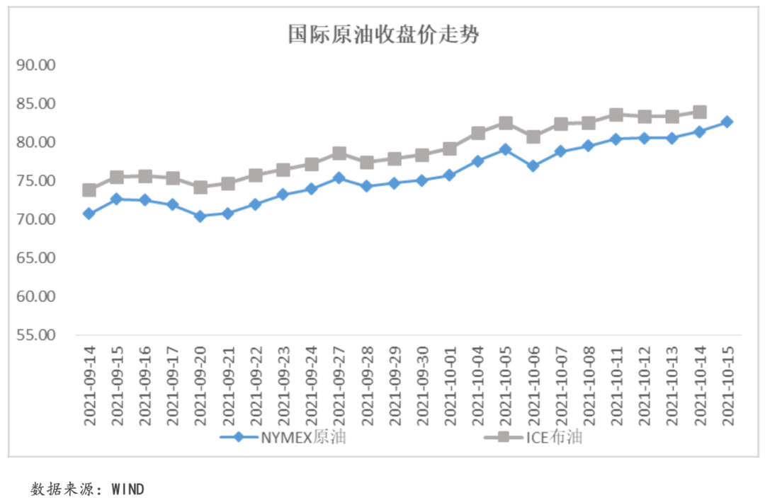 本周,國際原油市場供需失衡仍在持續,國際原油價格延續上漲趨勢。從需求端看,全球經濟復蘇導致工業需求強勁,同時由于近期飆升的煤炭和天然氣價格推升電力價格,導致工業生產由清潔能源向化石能源轉移,疊加各國放開旅行限制、北半球冬季來臨因素影響,原油需求大幅上漲。截至本周五收盤,NYMEX原油價格收于82.66美元/桶,周內累計收漲3.86%,突破80美元/桶關口;ICE布油價格收于84.92美元/桶,周內累計收漲2.75%,周內一度突破85美元/桶關口。