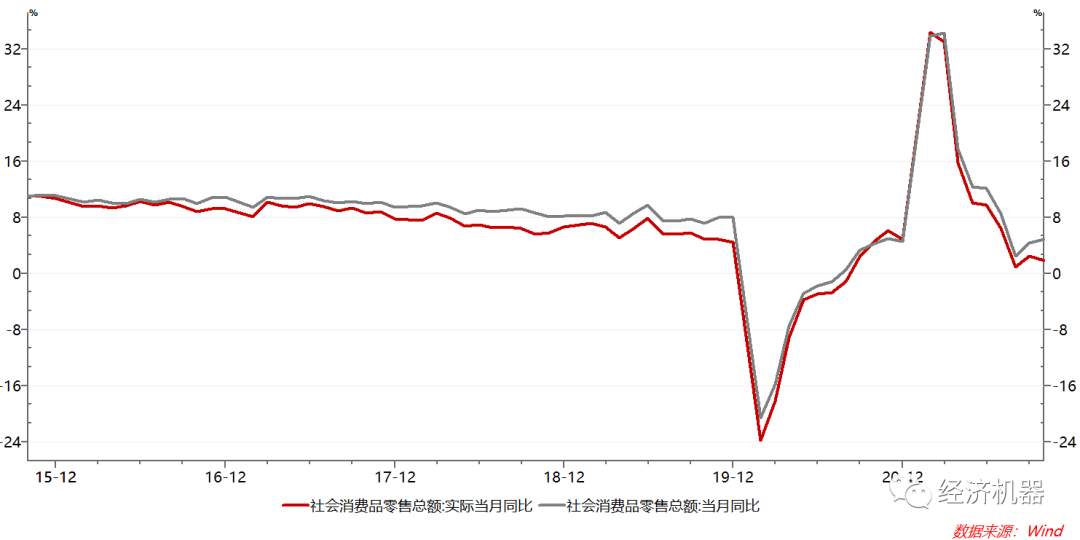 具體看,可選消費中,汽車和建筑裝潢保持疲弱,石油制品和家電增速改善。汽車消費下降,可能與供應鏈斷裂下的“芯片危機”有關,更反映了周期下行下的需求疲弱。建筑裝潢銷售額下降與近期地產市場快速惡化趨勢像吻合。石油及制品增速大幅上升,更多地是油價高企帶來的價格效應。考慮到汽車銷量的下降,剔除價格因素后,石油消費會弱的多(圖4)。
