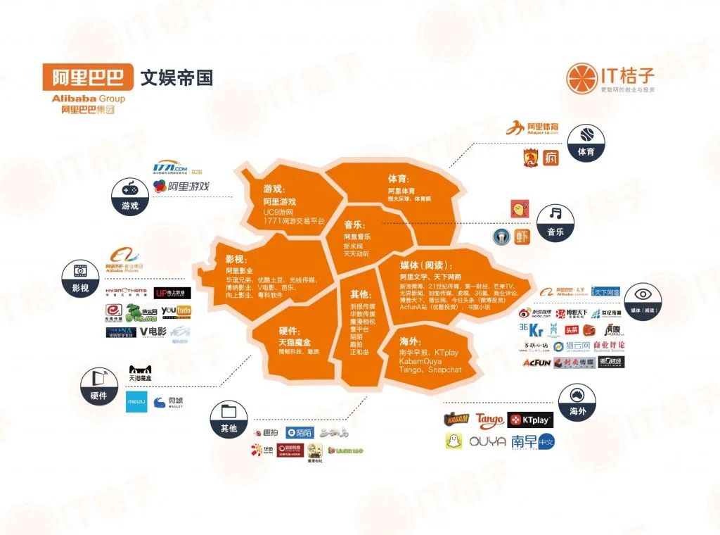 除此之外,阿里還針對蝦米音樂、天天動聽、優酷土豆、阿里影業、華誼兄弟、光線傳媒、芒果超媒等文娛產業類公司進行投資,試圖構造大文娛的閉環。