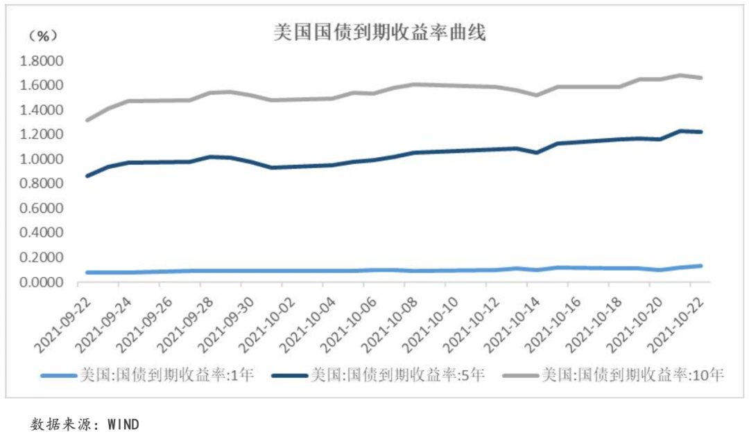 本周,美國公布數據顯示美國高通脹仍將持續運行,各期限美債收益率紛紛上漲。具體來看,本周1年期、5年期和10年期美國國債平均收益率較上周上漲0.65個BP、10.05個BP和8.10個BP至0.11%、1.19%和1.65%。