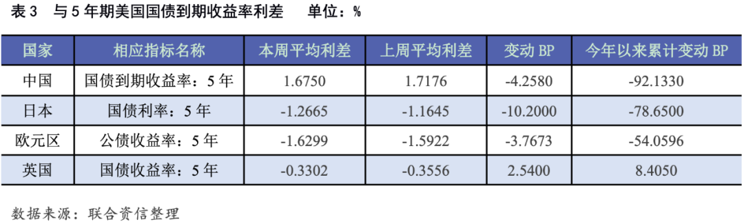 本周各期限中美國債平均收益率利差走勢不一,1年期中美國債平均收益率利差分別較上周走擴2.20個BP至2.25%;5年期和10年期中美國債平均收益率利差分別較上周收窄4.26個和4.03個BP至1.68%和1.36%。本周1年期、5年期和10年期日美國債平均收益率利差分別較上周走擴0.63個、10.20個和8.85個BP至-0.23%、-1.27%和-1.57%。本周1年期歐元區公債與相應期限美債平均收益率利差分別較上周收窄1.80個BP至-0.82%;5年期和10年期歐元區公債與相應期限美債平均收益率利差分別較上周走擴3.77個和5.46個BP至-1.63%和-1.75%。本周5年期英美國債平均收益率利差分別較上周收窄2.54個BP至-0.33%;10年英美國債平均收益率利差分別較上周走擴2.30個BP至-0.52%。