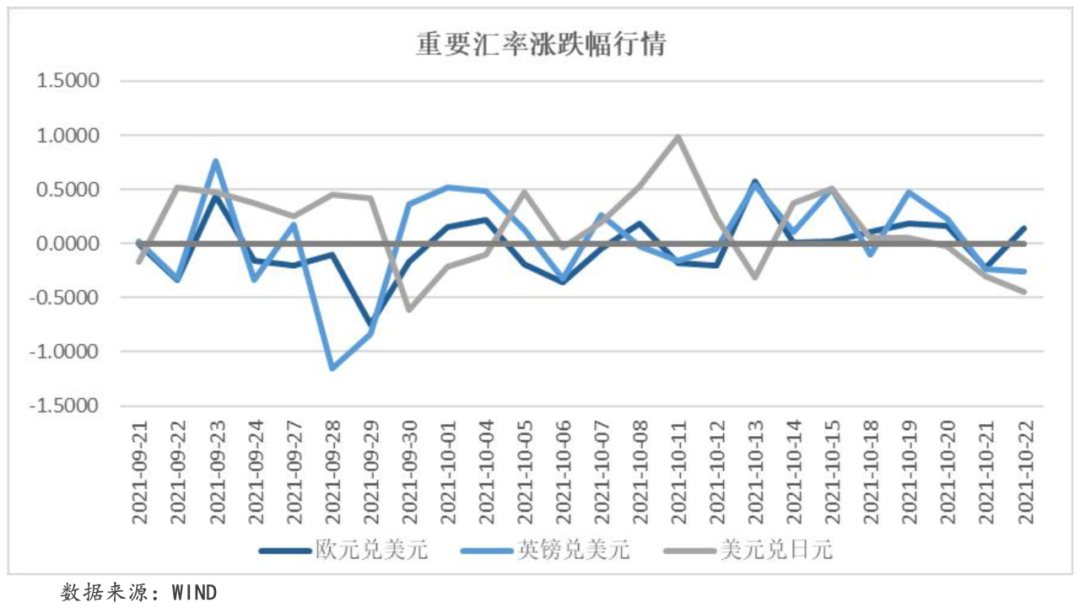 本周,在高通脹壓力以及美元受到打壓的背景下,歐元暫時保持升勢。本周歐元兌美元收于1.1642,周內累計收漲0.34%。英國10月綜合PMI數據繼續上行,達到5月以來的最高位,企業復蘇勢頭強勁,支撐英鎊表現。本周英鎊兌美元收于1.3758,周內累計收漲0.03%。本周,美元兌日元收于113.5000,周內累計收跌0.66%。