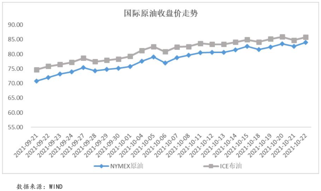 本周,國際油價繼續周內全面上漲。一是隨著全球經濟復蘇步伐的加快,石油需求顯著上升,如10月美國和歐元區PMI制造業和服務業活動指數仍然高于50,經濟活動仍在擴張;二是隨著亞洲市場對石油需求的上升(韓國11月原油購買量創下歷史最高水平),當下的石油供給結構將進一步緊張。三是各國能源儲備逐漸下降的基礎上,OPEC+仍保持原計劃產出,供應趨緊??傮w來看,在供應不足的條件下,強勁的需求拉動石油價格上揚。截至本周五收盤,NYMEX原油價格收于83.98美元/桶,周內累計收漲2.41%;ICE布油價格收于85.77美元/桶,周內累計收漲0.97%。