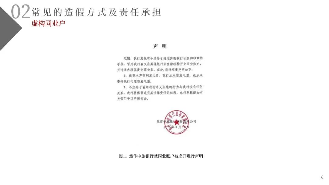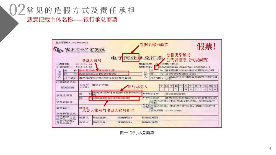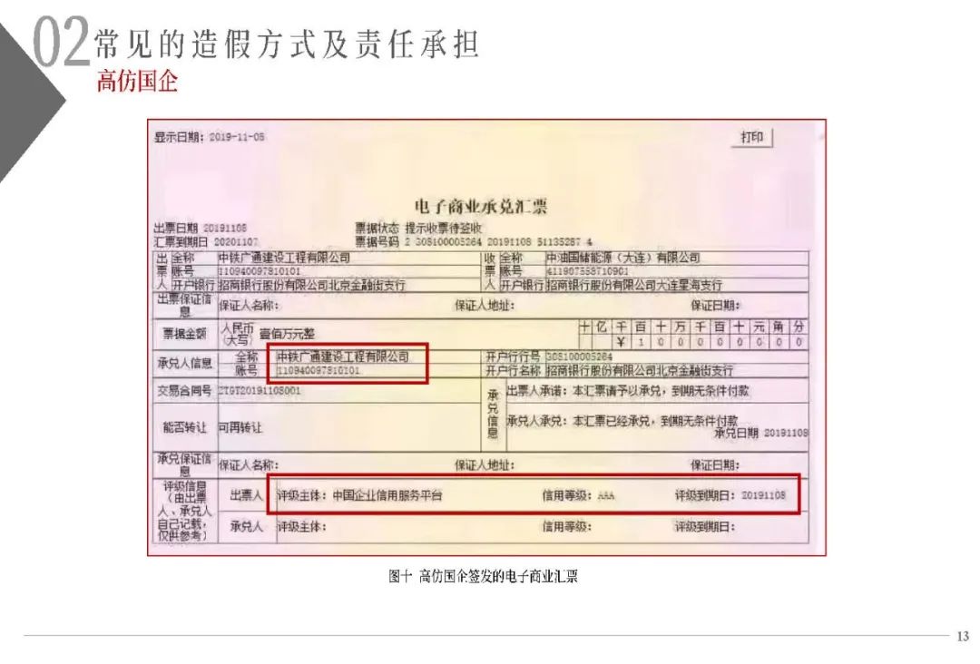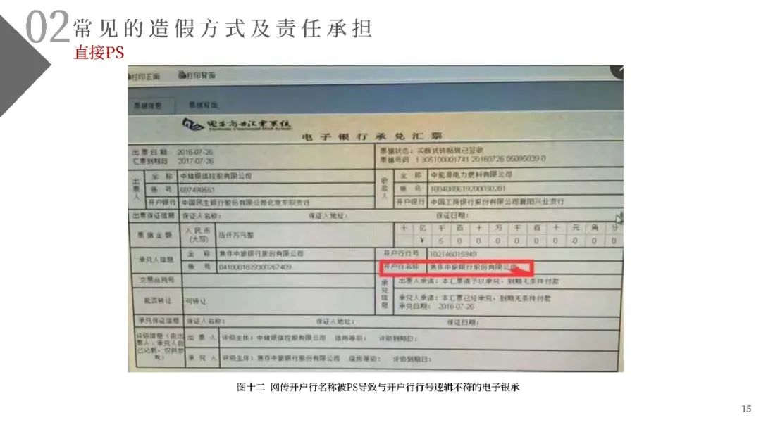 (一)不法分子精心設(shè)計(jì)、反復(fù)嘗試,通過(guò)在不同的銀行反復(fù)多次開(kāi)戶的方式尋找開(kāi)戶銀行的系統(tǒng)漏洞。利用部分開(kāi)戶銀行未對(duì)票據(jù)行為人與實(shí)際開(kāi)戶企業(yè)名稱進(jìn)行一致性校驗(yàn)的漏洞,通過(guò)在商業(yè)承兌匯票的承兌人名稱或保證人名稱上惡意記載為“中國(guó)某行”、“某行股份有限公司”或“某某銀行”的方式簽發(fā)電子商業(yè)承兌匯票,企圖冒充銀行承兌匯票;