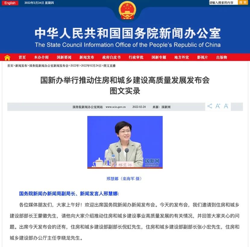 2022年2月24日,國新辦舉辦“推動住房和城鄉(xiāng)建設(shè)高質(zhì)量發(fā)展發(fā)布會”,提出重點抓好加強(qiáng)房地產(chǎn)市場調(diào)控、推進(jìn)住房供給側(cè)結(jié)構(gòu)性改革、實施城市更新行動、實施鄉(xiāng)村建設(shè)行動、落實碳達(dá)峰碳中和目標(biāo)任務(wù)、推動建筑業(yè)轉(zhuǎn)型升級、推動改革創(chuàng)新和法治建設(shè)、加強(qiáng)黨的建設(shè)等工作,推動住房和城鄉(xiāng)建設(shè)事業(yè)高質(zhì)量發(fā)展。