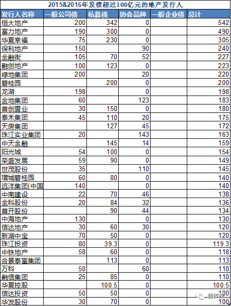下面統(tǒng)計(jì)了2015年和2016年債券發(fā)行金額超過100億元的發(fā)行人,不乏恒大、華夏幸福、天房、泰禾等網(wǎng)紅高收益主體。從地產(chǎn)三大信用債的選擇方面,明顯是交易所品種>協(xié)會(huì)品種>企業(yè)債。