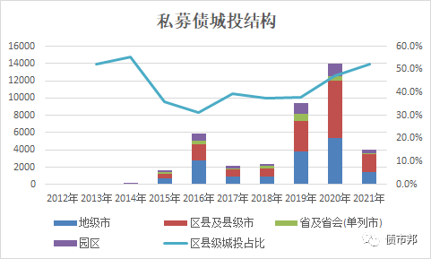 更加精確的說,交易所是選擇大力發(fā)展低層次城投發(fā)行人,區(qū)縣級(jí)城投私募債發(fā)行占比逐年攀升,目前占比已經(jīng)將近50%。作為對(duì)比,2020年區(qū)縣級(jí)城投公司債中的占比僅為9%。這個(gè)差異說明,需要上報(bào)證監(jiān)會(huì)注冊(cè)的一般公司債和僅需要交易所備案的私募債雖然都叫公司債,但其管理思路是有大不同的,不能混為一談。