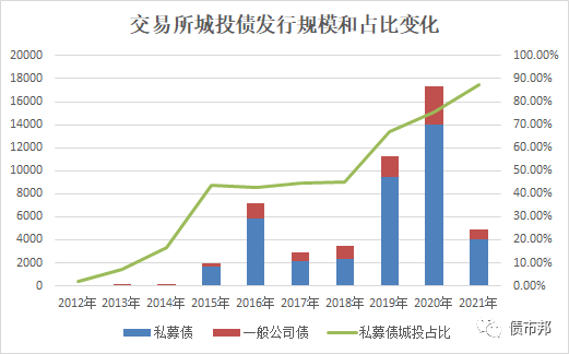但交易所則是選擇了”暗度陳倉(cāng)“,在公司債新政的第一年,就發(fā)行了1600億元的城投私募債,之后的城投私募債發(fā)行規(guī)模和發(fā)行占比不斷攀升。2020年城投私募債的發(fā)行金額已經(jīng)來到將近14000億元的水平,城投私募債占私募債總發(fā)行量之比已經(jīng)超過75%,私募債已經(jīng)成為信用債品種上的”城投之王“。
