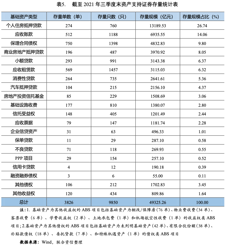 截至2021年三季度末,債券市場上共有3826單9850只資產(chǎn)支持證券存續(xù),本金存量規(guī)模為49325.26億元。從存量規(guī)模占比來看(見表5),前五大基礎資產(chǎn)類型分別為個人住房抵押貸款(26.74%)、應收賬款(14.06%)、保理合同債權(9.80%)、商業(yè)房地產(chǎn)抵押貸款(8.05%)和小額貸款(6.37%)。