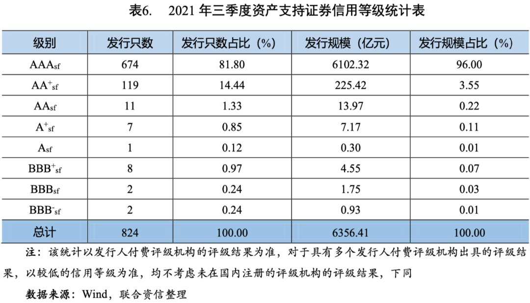 2021年三季度,新發(fā)行的資產(chǎn)支持證券中,有824只具有信用評級,總體上集中于AAAsf和AA+sf,AAAsf級資產(chǎn)支持證券的發(fā)行只數(shù)占比81.80%,發(fā)行規(guī)模占比96.00%;AA+sf級資產(chǎn)支持證券的發(fā)行只數(shù)占比約14.44%,發(fā)行規(guī)模占比約3.55%(見表6)。