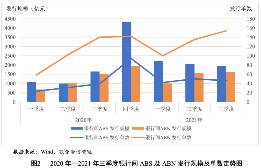 從銀行間市場來看,2021年三季度,信貸資產(chǎn)支持證券(以下簡稱“銀行間ABS”)共發(fā)行46單131只,發(fā)行規(guī)模為1936.21億元,發(fā)行單數(shù)、只數(shù)和發(fā)行規(guī)模環(huán)比均有所下降,與上年同期相比,發(fā)行單數(shù)、只數(shù)、發(fā)行規(guī)模均大幅上升;銀行間資產(chǎn)支持票據(jù)(以下簡稱“銀行間ABN”)共發(fā)行154單372只,發(fā)行規(guī)模為1628.77億元,發(fā)行單數(shù)、只數(shù)和規(guī)模環(huán)比、同比均有所增長(見表2和圖2)。總體看,三季度銀行間ABS發(fā)行單數(shù)、只數(shù)和規(guī)模同比增幅較銀行間ABN更高,主要源于基礎資產(chǎn)為小額貸款的資產(chǎn)支持證券發(fā)行同比增幅較大,在引導金融機構加大對小微企業(yè)支持力度的政策背景下,發(fā)行小微企業(yè)貸款ABS是銀行用來盤活存量小微貸款、打通小微企業(yè)融資渠道、助力普惠金融發(fā)展的一項重要舉措。