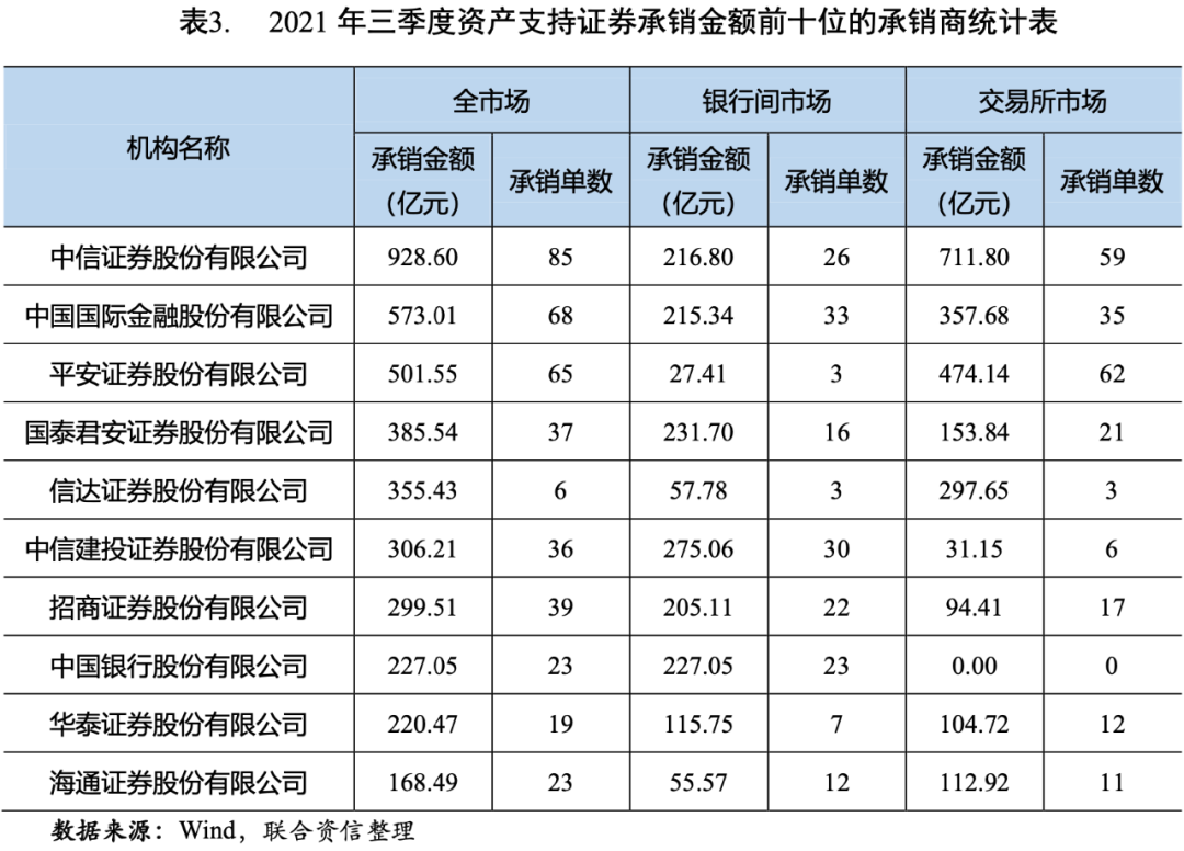 從資產(chǎn)支持證券的承銷情況來看,2021年三季度,中信證券股份有限公司、中國國際金融股份有限公司和平安證券股份有限公司的承銷金額、承銷單數(shù)均位居前三位(見表3)。