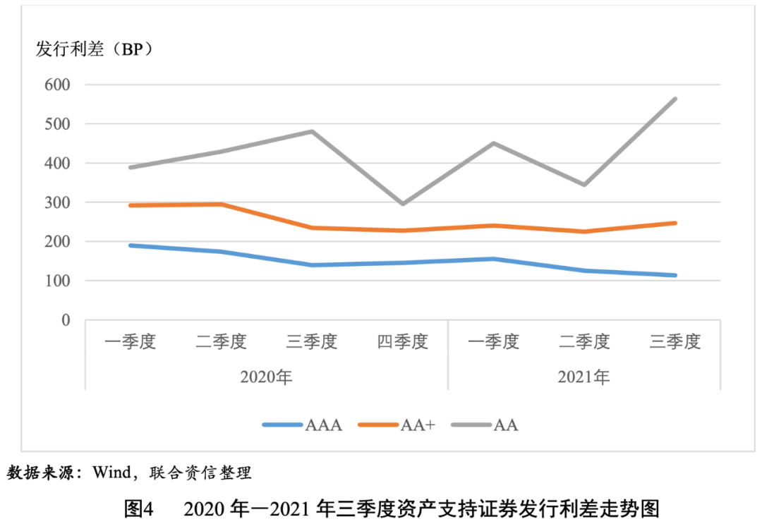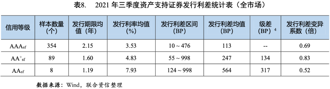 2021年三季度,資產(chǎn)支持證券的發(fā)行利率和利差均值均隨信用等級的下降而上升(見圖3和圖4),說明信用評級對資產(chǎn)支持證券的信用風險具有較好的區(qū)分度。AAAsf、AA+sf和AAsf級資產(chǎn)支持證券的發(fā)行利差均值分別為113BP、247BP和564BP,AAAsf級資產(chǎn)支持證券的發(fā)行利差均值環(huán)比下降12BP,同比下降26BP;AA+sf和AAsf級資產(chǎn)支持證券的發(fā)行利差均值環(huán)比分別上升22BP和220BP,同比分別上升13BP和84BP。AAAsf級和AA+sf級之間的級差為134BP,同比、環(huán)比均有所上升,反映了在經(jīng)濟恢復趨緩背景下,市場不確定性上升,投資者對低級別資產(chǎn)支持證券要求的風險溢價進一步提高;AA+sf級和AAsf級之間的級差為317BP,可能與AAsf級資產(chǎn)支持證券樣本數(shù)目過少而缺乏代表性有關。AA+sf級資產(chǎn)支持證券的發(fā)行利差的變異系數(shù)相對較高,說明投資者對AA+sf級資產(chǎn)支持證券的信用風險判斷存在分化。