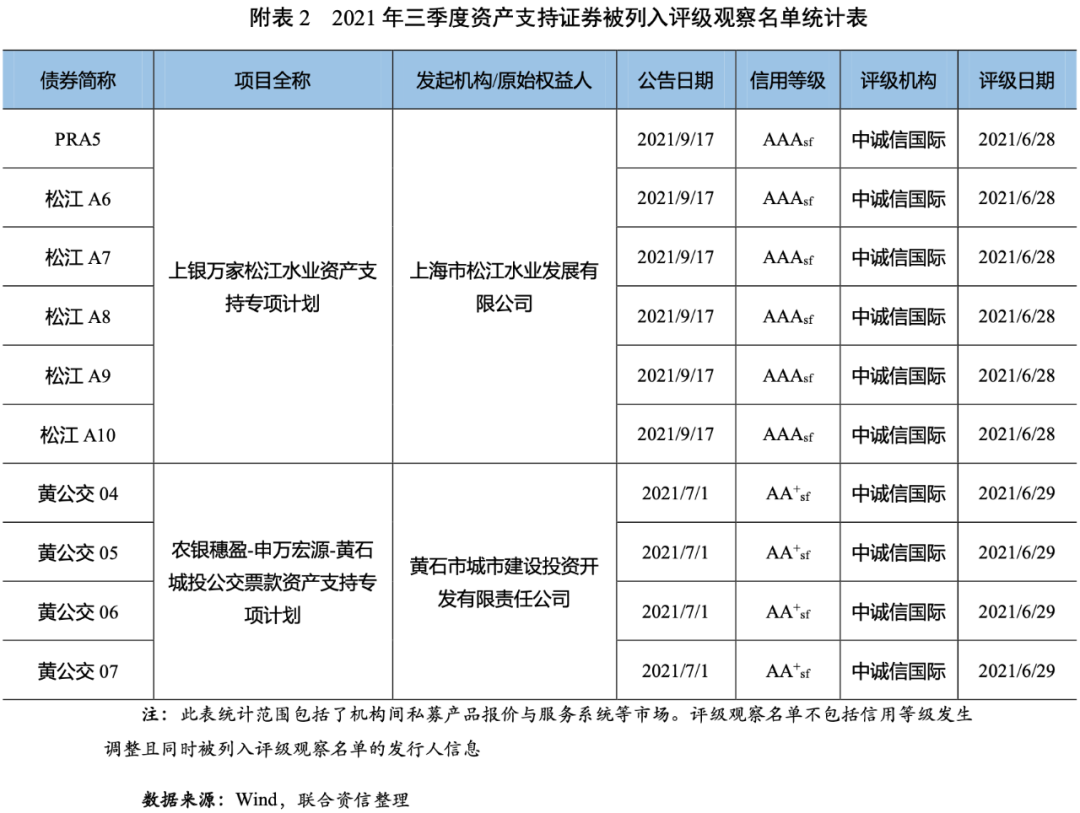 2021年三季度,債券市場上未出現(xiàn)資產(chǎn)支持證券違約;14只資產(chǎn)支持證券信用評級下調(diào)(見附表1),同比大幅增加7只;10只資產(chǎn)支持證券被列入評級觀察名單[2](見附表2),同比減少4只。