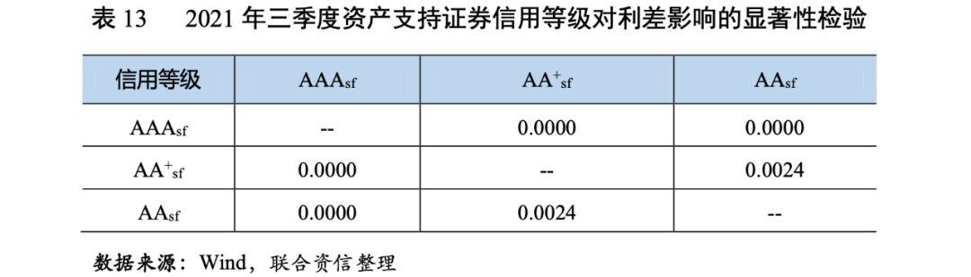 為了檢驗信用等級對資產(chǎn)支持證券發(fā)行利差影響的顯著性,我們采用了Mann-Whitney U 兩獨立樣本非參數(shù)檢驗方法,對AAAsf、AA+sf和AAsf級兩兩之間的利差分布進行顯著性檢驗。2021年三季度,在95%的置信水平下,AAAsf級和AA+sf級、AAAsf級和AAsf級之間、AA+sf級和AAsf級之間均通過檢驗,具有顯著性差異。整體來看,信用等級對發(fā)行利差具有區(qū)分性,評級結(jié)果得到了投資者認可(表13)。