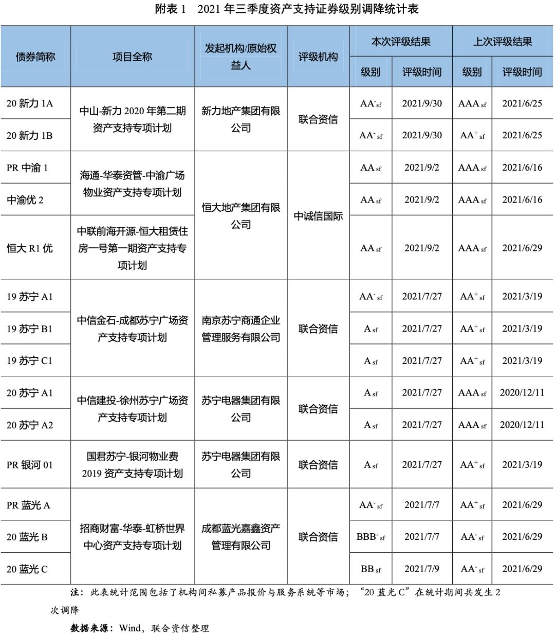 級別下調(diào)方面,市場共有5家原始權益人發(fā)起的7單14只資產(chǎn)支持證券債項評級發(fā)生下調(diào),原始權益人家數(shù)同比增加2家,發(fā)行單數(shù)同比增加4單,只數(shù)同比增加7只。本季度資產(chǎn)支持證券發(fā)生評級下調(diào)的級別變動較大,其中8只債券下調(diào)3個級別及以上。本季度級別下調(diào)資產(chǎn)支持證券涉及的行業(yè)為房地產(chǎn)。從級別下調(diào)原因來看,本季度資產(chǎn)支持證券級別下調(diào)主要原因是2021年以來國家加大對房地產(chǎn)行業(yè)的調(diào)控,在“三道紅線”、“兩個集中”等政策壓力下,房地產(chǎn)企業(yè)銷售增速下滑,投資增速回落,短期償債壓力加大,在此背景下,負債率較高、擴張較為激進的恒大地產(chǎn)集團有限公司(海通-華泰資管-中渝廣場物業(yè)資產(chǎn)支持專項計劃和中聯(lián)前海開源-恒大租賃住房一號第一期資產(chǎn)支持專項計劃的差額支付承諾人)、新力地產(chǎn)集團有限公司(中山-新力2020年第二期資產(chǎn)支持專項計劃的差額支付承諾人)和四川藍光發(fā)展股份有限公司(招商財富-華泰-虹橋世界中心資產(chǎn)支持專項計劃的差額支付承諾人)深陷債務危機,造成相關債券級別的大幅下調(diào)。此外,受蘇寧電器集團有限公司主體級別發(fā)生下調(diào)影響,其作為差額支付承諾人的中信建投-徐州蘇寧廣場資產(chǎn)支持專項計劃和國君蘇寧-銀河物業(yè)費2019資產(chǎn)支持專項計劃以及其作為擔保人的中信金石-成都蘇寧廣場資產(chǎn)支持專項計劃的相關債券級別均出現(xiàn)大幅下調(diào)。