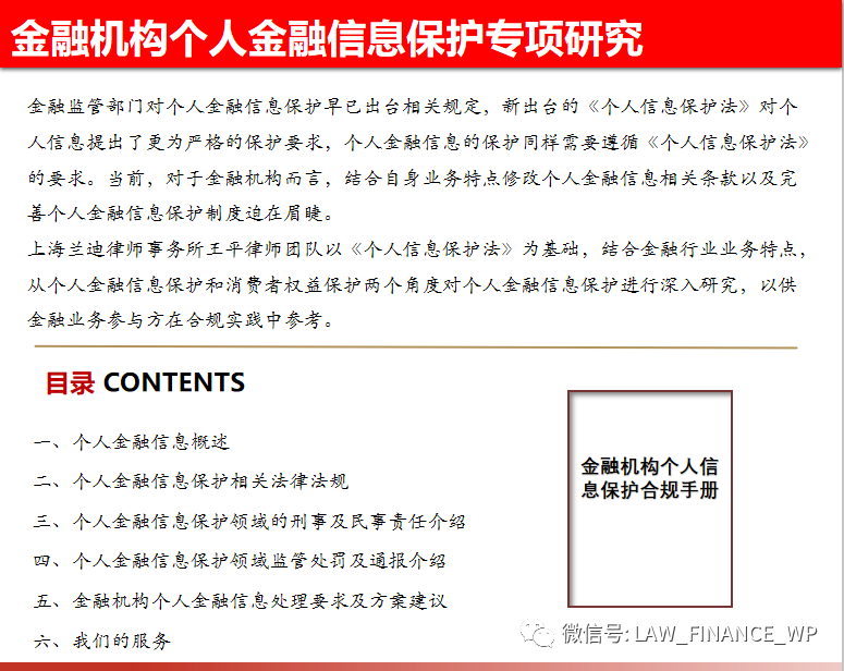 上海蘭迪律師事務所王平律師團隊以《個人信息保護法》為基礎,結合金融行業業務特點,從個人金融信息保護和消費者權益保護兩個角度對個人金融信息保護進行深入研究,以供金融業務參與方在合規實踐中參考。