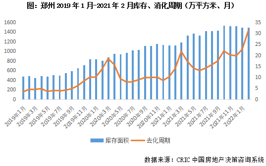 CRIC數據顯示,鄭州新房狹義庫存規模就已接近1500萬平方米,消化周期超過20個月,2021年2月,由于成交持續低位徘徊,新房庫存消化周期更是躍升至31個月。