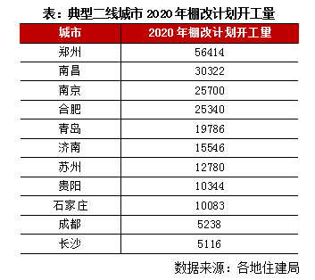 近幾年,鄭州棚改規模明顯趨于收縮,2018年計劃開工量驟降至2.1萬套,同比下降78%,2021年更是降至近8年最低位1.5萬套。不過橫向對比來看,鄭州的棚改規模仍居于二線城市前列,以2020年為例,在數據可得的11個二線城市中,鄭州棚改規模排名第一。