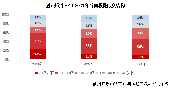 通讀新政全文還可以發現,支持改善性需求有效釋放貫穿文件始終,新政為何要重點著墨改善性需求?原因在于鄭州新房的成交結構中,剛需占主導地位,這也意味著改善性購房需求未來仍有較大釋放空間。2021年,鄭州100平方米以下新房成交套數占比接近50%,120平方米以下新房成交占比達到70%,而140-180平方米、180平方米以上改善、終改成交占比僅為11%和3%。
