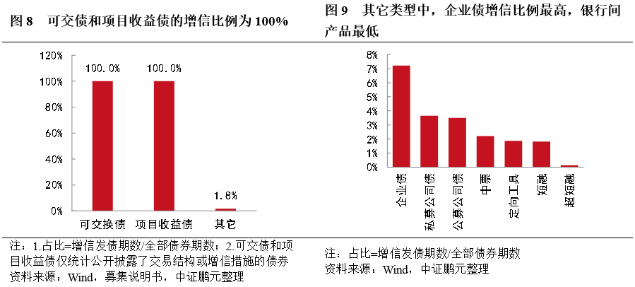 1.可交換債和項目收益債的增信比例為100%,其它債券類型平均增信比例為1.8%,其中企業債的增信比例最高,銀行間產品則最低