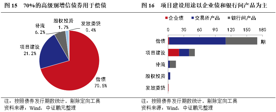 1.約70%的高級別增信債券募集資金用于償還到期債券和債務,僅有約20%的債券用于項目建設